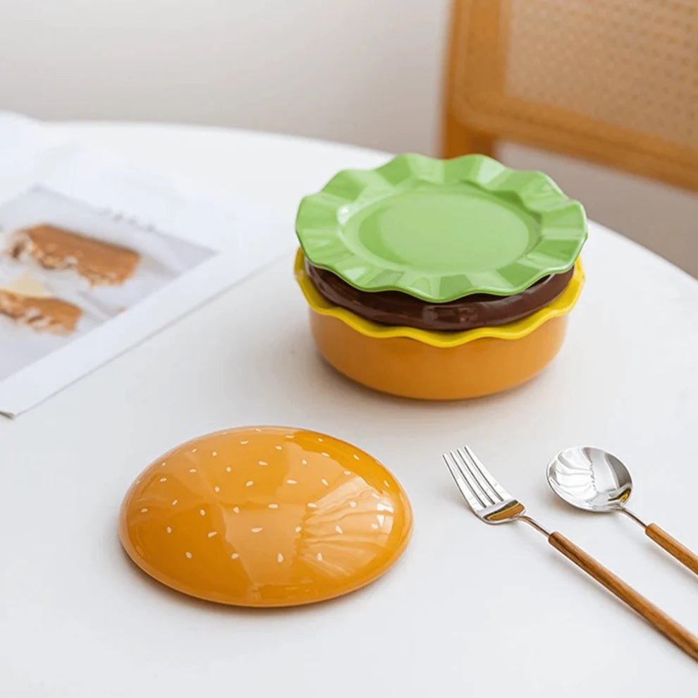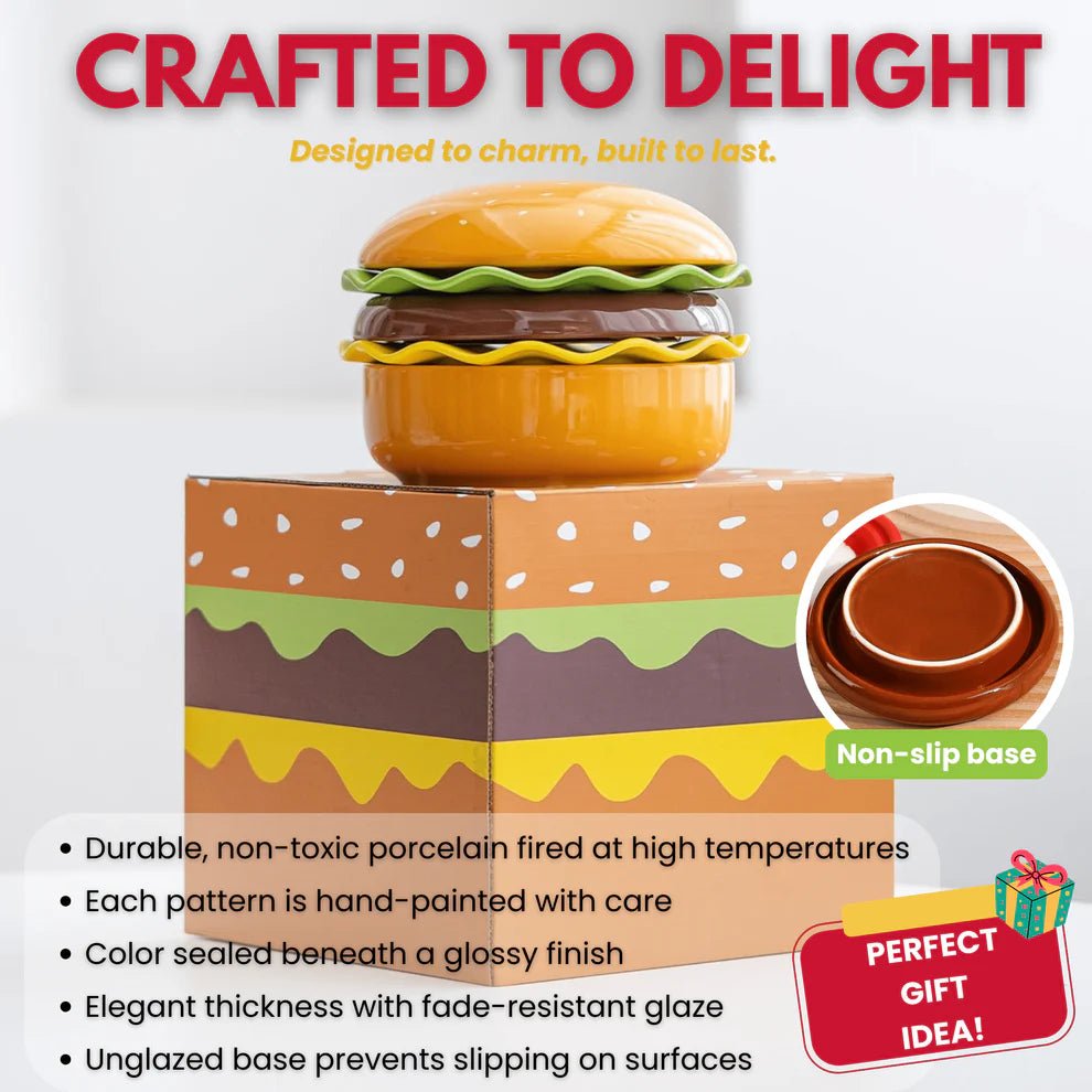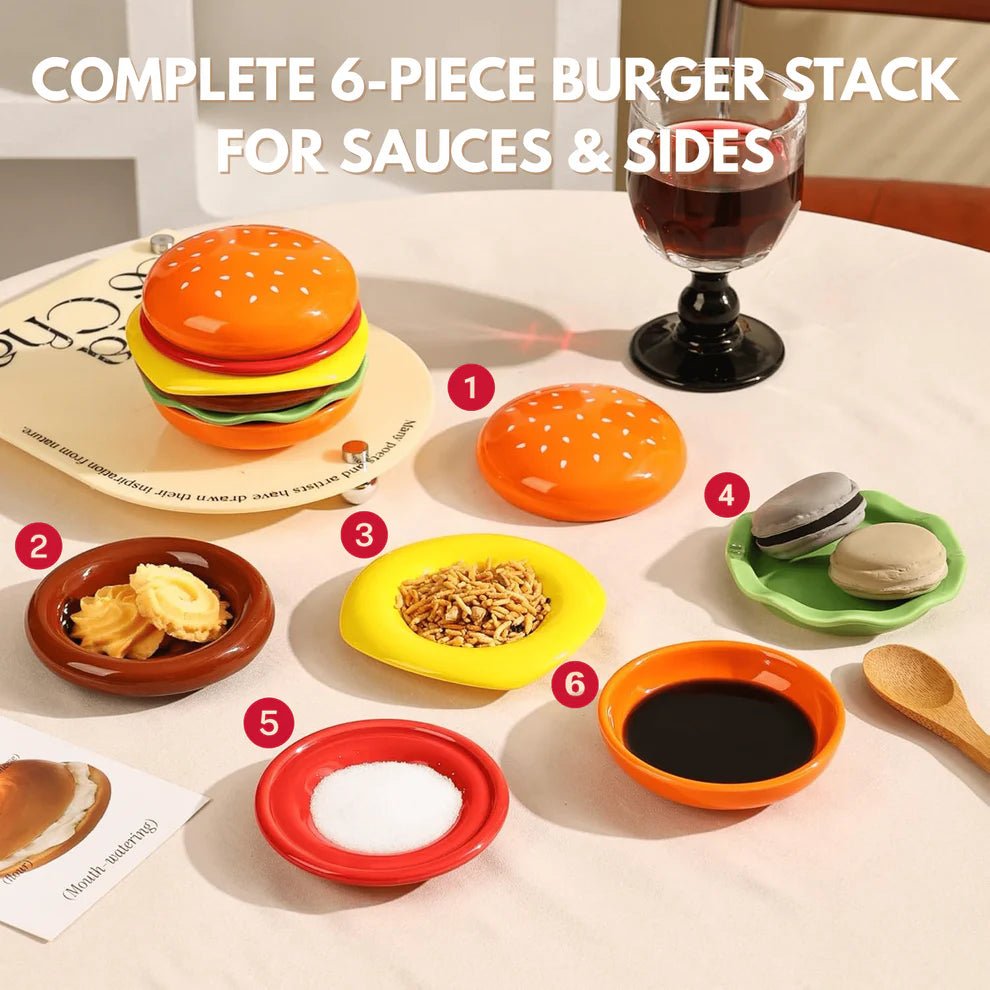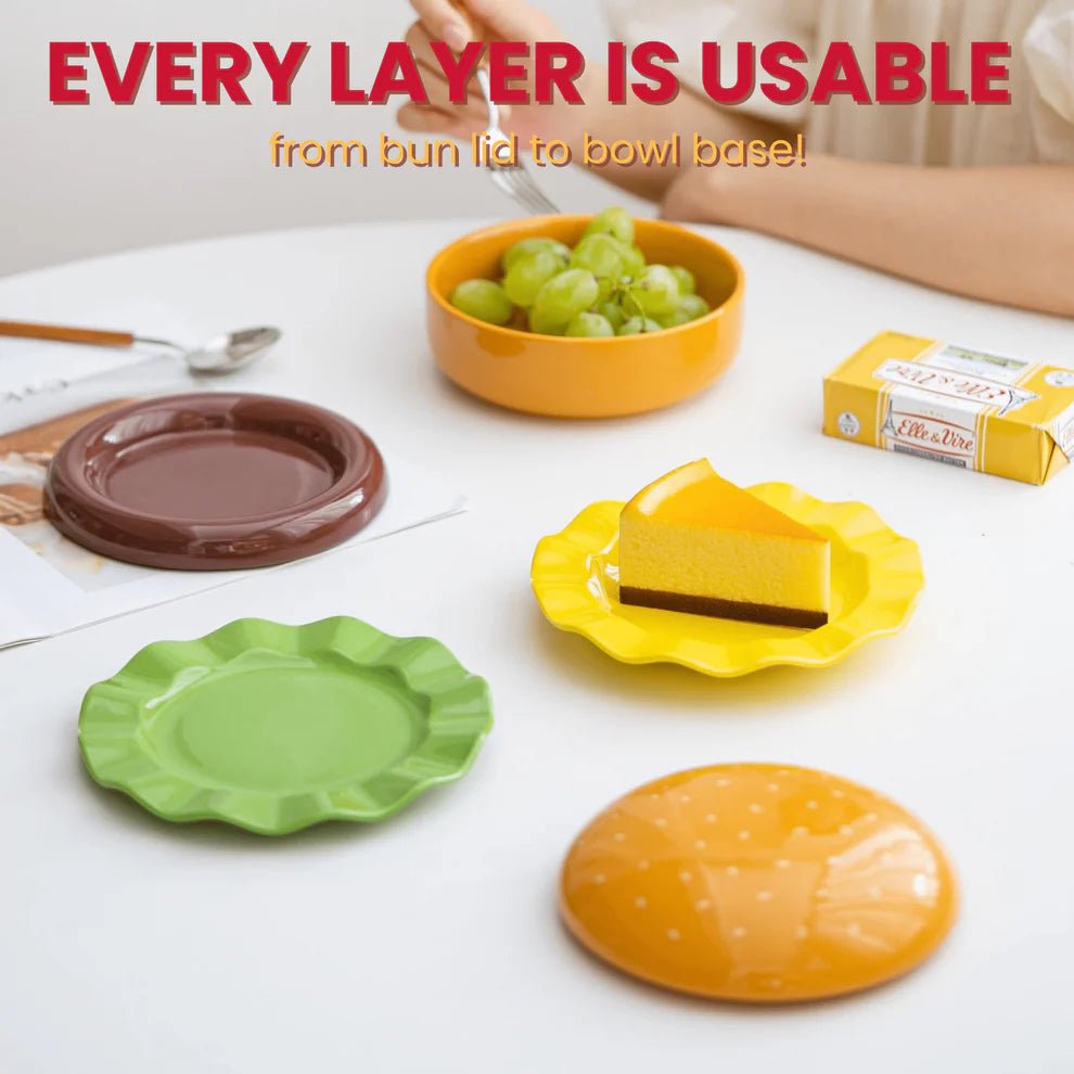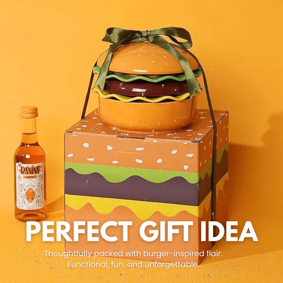 A creative fusion of style and function — each layer is artfully crafted to resemble a gourmet burger, from bun to patty. This playful yet sophisticated design transforms ordinary dining into a memorable experience, sparking joy at every table setting.